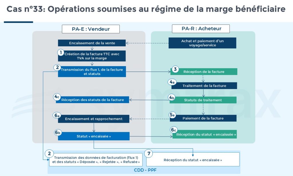 L’agence effectue un e-reporting (flux 10.3 et 10.4) sauf s’il a opté pour les débits. Elle doit e-reporter la base HT de la marge et la TVA due correspondante, calculées par jour ou par vente.