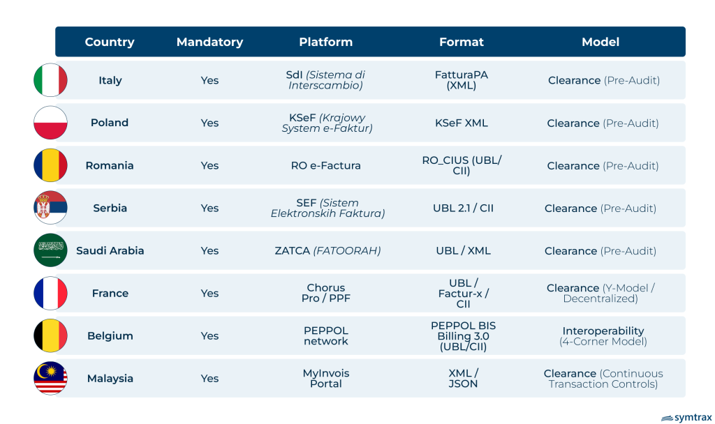 E-invoicing requirements vary by country, with governments defining specific formats, clearance models, and reporting obligations. For example, Saudi Arabia mandates e-invoicing through ZATCA, while the UAE and Oman are rolling out phased e-invoicing frameworks, alongside European countries such as France, Germany, Belgium, Poland, and Spain, with requirements taking effect from 2026. Understanding these regional requirements is essential for compliance.